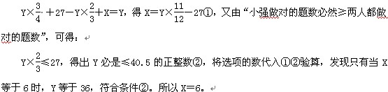 【解析】D。設(shè)都沒做完的題目共有X道,題目總數(shù)為Y道,則“小明做對的+小強做對的-他倆都做對的+他倆都做錯的=總題數(shù)”,即: