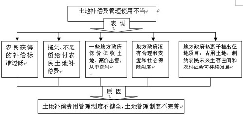 其次,通過對(duì)上述問題的原因的查找,就可以發(fā)現(xiàn)地方政府土地補(bǔ)償費(fèi)用管理制度不科學(xué)不健全是造成上述問題的主要原因。具體分析過程如下圖:
