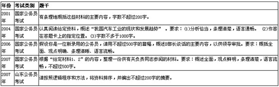 國家公務員考試從2001年以后就沒有再用“概括內容”這樣的字眼來提問了,但這樣的提問方式被很多地方公務員考試和一些模擬試卷沿用。雖然提問方式變了,但問題類型是一樣的。凡是出現(xiàn)要求寫摘要、整理資料等一系列的表達方式都可以看作是概括內容。