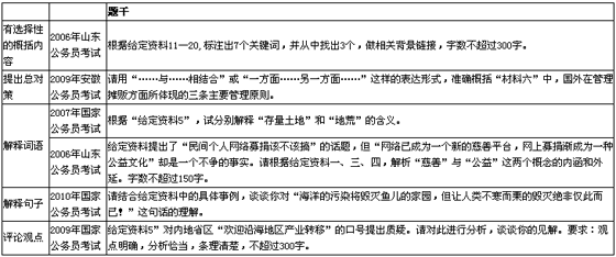 國家公務員考試申論考試,從2000年的三道題到最多的2008年的六道大題、七道題,不僅在數(shù)量上有所增加,提問方式也有很大的轉變。提問方式的多樣化指同樣類別題采取不同的語言表達來提問。具體如下例。