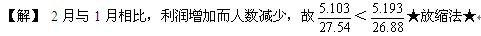 【例】 下圖是某跨國公司2010年1-6月份公司利潤與公司人數(shù)發(fā)展變化情況,從圖中數(shù)據(jù)可知,2010年2-6月份,該跨國公司人均利潤與上月相比有所下降的有幾個月?( )