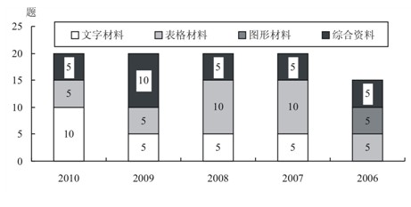 不論是國(guó)考還是浙考,資料分析的綜合材料是命題者的“寵兒”,從圖中可以看出,2006年以后,綜合材料每年均會(huì)出現(xiàn),這不僅是資料分析材料形式的變化,同時(shí)也提高了對(duì)考生綜合分析能力的要求。