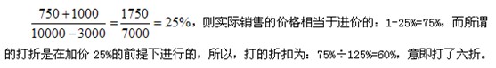 至于C項的75%,在加價銷售完30%之后,假如是在進價的基本上打七五折銷售完下剩的70%,所虧損的剛好是1750(10000×25%×70%),減去前面賣完30%的商品所賺的750,整體上虧的剛剛是1000元,實際上,我們都知道所謂的打折,都是在前一個價格的基礎(chǔ)上打的折扣,所以,在進價25%的利潤來定價的前提下再打七五折,肯定是不行的了。據(jù)此,可以排除C項。