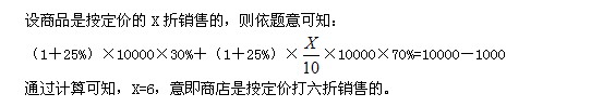 某商店花10000元進了一批商品,按期望獲得相當于進價25%的利潤來定價,結(jié)果只銷售了商品總量的30%。為盡快完成資金周轉(zhuǎn),商店決定打折銷售,這樣賣完全部商品后,虧本1000元。問商店是按定價打幾折銷售的?
