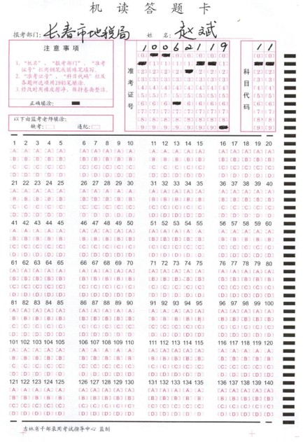 (2)監(jiān)考人員發(fā)給每位考生一頁答題卡,給考生約兩分鐘時(shí)間按規(guī)定要求在答題卡上填涂自己的姓名和考號(hào)。