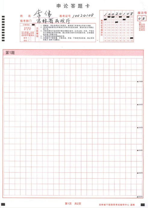 (1)用鋼筆、圓珠筆或簽字筆在姓名、報(bào)考部門欄填好本人姓名和報(bào)考部門,并在準(zhǔn)考證號(hào)一欄的8個(gè)空白方框中填上本人準(zhǔn)考證號(hào)(8位數(shù))。