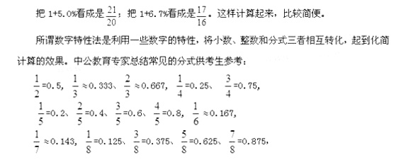 在備考的過程中,很多情況是將以上方法結(jié)合起來靈活運(yùn)用,將小數(shù)化為分?jǐn)?shù)后,可采用估計(jì)法簡化除數(shù),并結(jié)合首數(shù)法快速的得出答案。