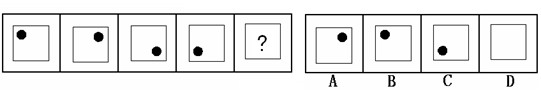 (答案:B。黑點(diǎn)在正方形中順時(shí)針移動(dòng)。在第5個(gè)圖形中,應(yīng)該正好移動(dòng)到左上角。)