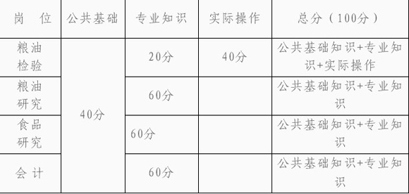 筆試分公共基礎(chǔ)知識(shí)(占筆試成績的40%)和專業(yè)測試(占筆試成績的60%,糧油檢驗(yàn)崗位加考實(shí)際操作)兩部份。筆試成績設(shè)最低分?jǐn)?shù)控制線50分,低于50分者不得參加面試。