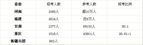 2011年9月17日,河南、福建、甘肅、重慶、新疆生產(chǎn)建設(shè)兵團(tuán)同日舉行公務(wù)員公共科目筆試。據(jù)統(tǒng)計(jì),這5地共招錄近萬(wàn)人,涉及考生近30萬(wàn)人。
