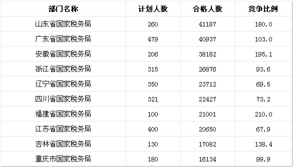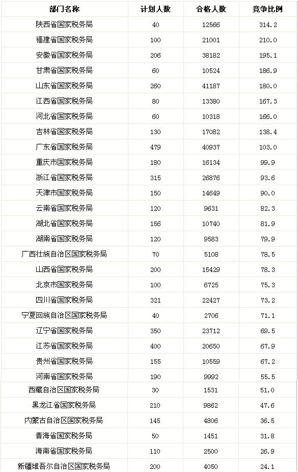 2011年國(guó)家公務(wù)員考試稅務(wù)部門報(bào)名合格人數(shù)為434298人,平均比例已達(dá)到86.4:1。相比于2010年的426609人,增加了7689人。稅務(wù)部門競(jìng)爭(zhēng)最激烈的部門是陜西省國(guó)家稅務(wù)局,比例為314.2:1。競(jìng)爭(zhēng)比例最小的稅務(wù)部門是新疆維吾爾自治區(qū)國(guó)家稅務(wù)局,競(jìng)爭(zhēng)比例為24.1 :1。