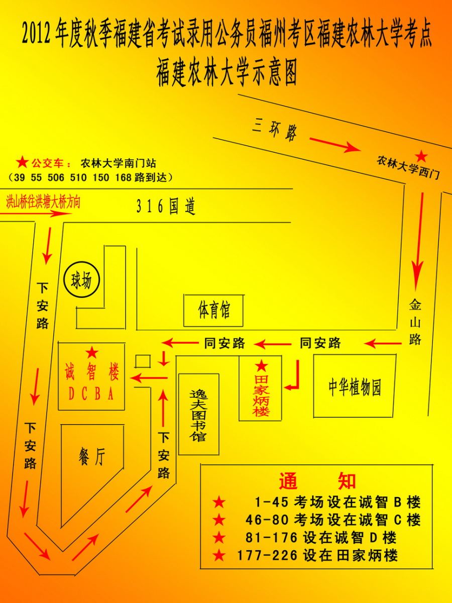 考生可乘坐39、55、150、168、506、510等線路公交到福建農林大學南門之后,再步行進入考點。