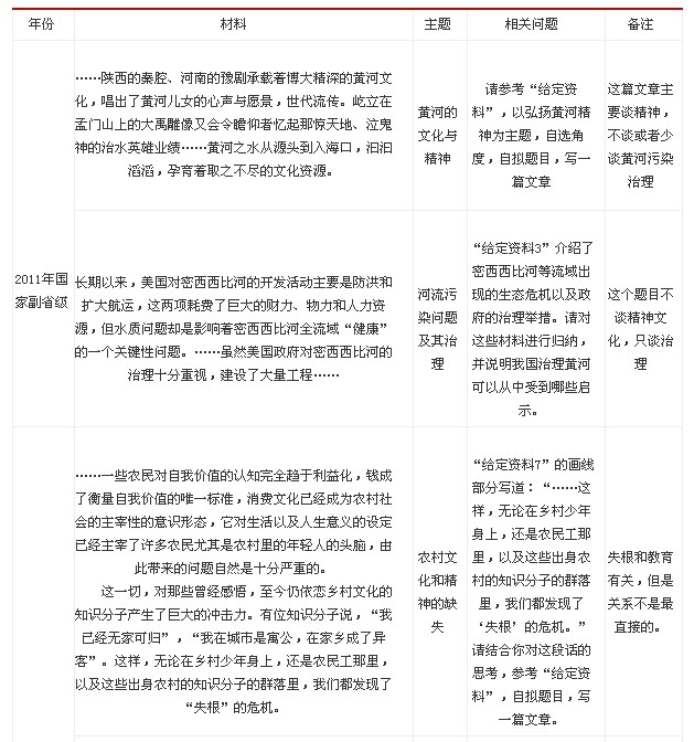 通過上述表格可以看到,2011年國家考試的材料中都包含兩個相互交叉但是又相互獨立的話題。如果我們把問題和材料分開,可以把一套題拆成兩套獨立的題。一份材料涉及幾個問題意味著有的問題是針對一些材料提出的,那個問題只和一些材料有關(guān)。這就決定了我們在做題的時候要對材料進(jìn)行取舍。建議在答題的時候一定要根據(jù)問題去篩選材料,一個題目不可能讓我們解決材料中的所有問題,哪怕是大文章的寫作都不需要把材料中的所有內(nèi)容堆砌起來。如果把不需要答得大而全的題目答面面俱到,這樣不僅難以做到,更重要的是不符合問題的要求,讓答題顯得沒有針對性。