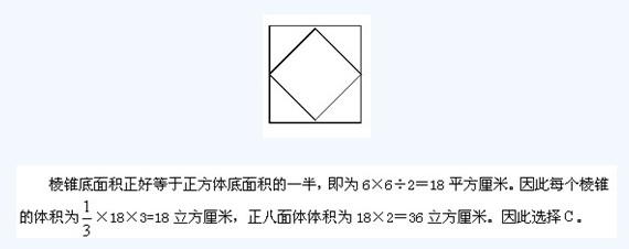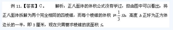 例11.連接正方體每個(gè)面的中心構(gòu)成一個(gè)正八面體(如下圖所示)。已知正方體的邊長為6厘米,問正八面體的體積為多少立方厘米?【2012-國家公務(wù)員考試-80】