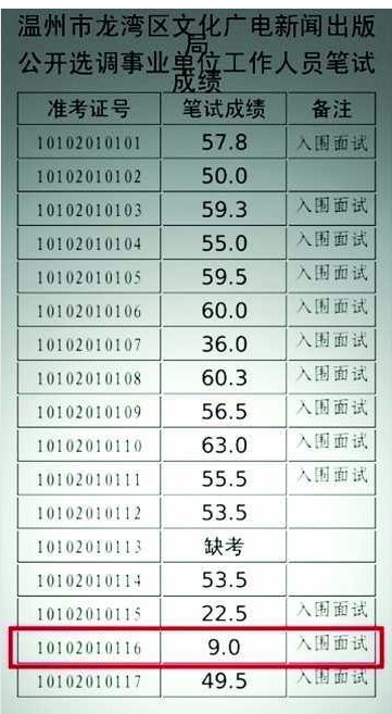“溫州一事業(yè)單位考試,考9分也入圍!”從昨天上午起,1名筆試成績(jī)僅為9分的應(yīng)試者,入圍溫州龍灣區(qū)文化廣電新聞出版局公開(kāi)選調(diào)事業(yè)單位人員面試的消息,在微博引發(fā)關(guān)注。