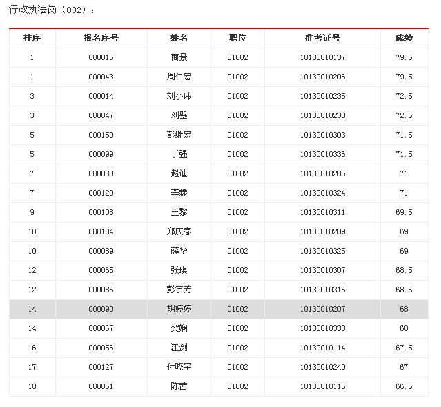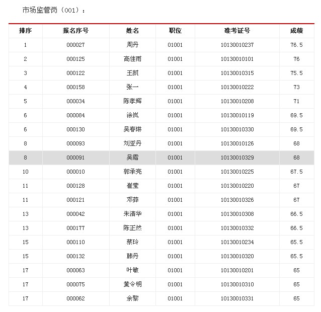 根據《省工商局公開遴選公務員公告》,按筆試成績從高到低的順序以及面試和遴選職位6:1的比例,周丹、高佳雨、王凱、張一、陳孝輝、涂嵐、吳春琳、劉亞丹、吳霜、郭承亮、崔瑩、鄧莽、朱清華、陳正然、蔡玲、韓丹、葉敏、黃令明、余黎等19人進入市場監(jiān)管崗(001)職位面試,商景、周仁宏、劉小瑋、劉?、彭繼宏、丁強、趙迪、李鑫、王黎、鄭慶春、薛華、張琪、彭宇芳、胡婷婷、賀嫻、江劍、付曉宇、陳茜等18人進入行政執(zhí)法崗(002)職位面試。請上述考生在12月15日上午面試前將身份證、準考證、紙質遴選報名登記表、誠信承諾書、學歷學位證書、工作經歷證明等材料原件及公務員登記表復印件(復印件上需加蓋單位人事部門紅章)交候考室工作人員。
