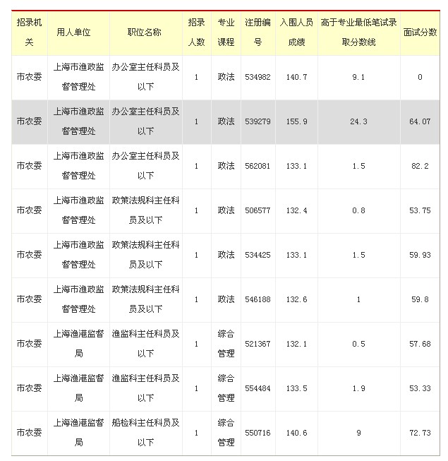 2012年上海市公務員考試:農(nóng)委分數(shù)線