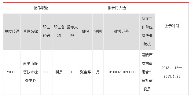 現(xiàn)根據(jù)《2012年福建省秋季考試錄用公務(wù)員公告》及南平市招考簡章要求,陸續(xù)對考試、體檢、考察合格擬錄用國家公務(wù)員和參照公務(wù)員法管理機關(guān)(單位)工作人員名單進行公示(具體公示期見表格),在此期間歡迎廣大群眾以來信來電來訪的形式實事求是反映情況,接待(來信投遞)科室:南平市委組織部干部三科,聯(lián)系電話:8823008。