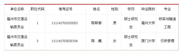 2012年秋福州市交通運(yùn)輸委員會(huì)擬錄人員公示