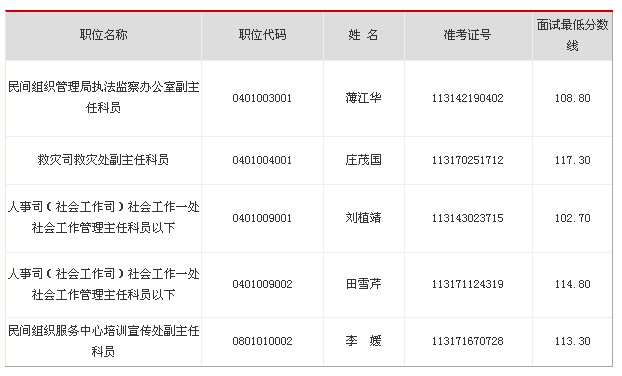 因部分考生自愿放棄面試資格,根據中組部、國家公務員局關于公務員招考面試工作的有關規(guī)定,經國家公務員局同意,按照公共科目筆試成績從高到低的順序遞補5個職位的5名考生進入面試名單,并相應調整這5個職位面試最低分數線: