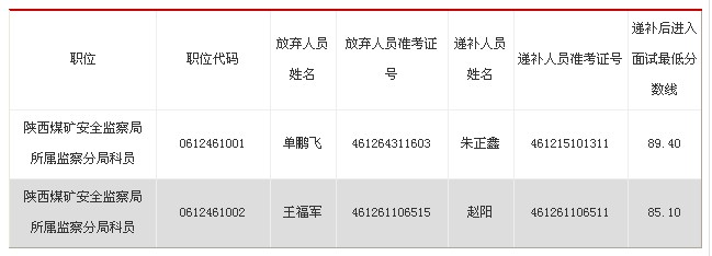 2013年面試人員遞補(bǔ)公告:陜西煤礦安全監(jiān)察局