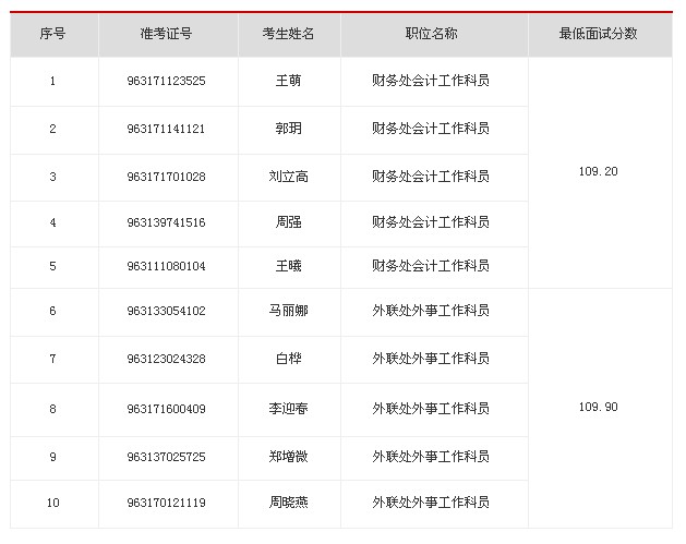 在公共科目筆試成績合格的考生中,按照每個職位筆試總成績從高到低的順序,共確定了10名面試對象。面試人員名單如下: