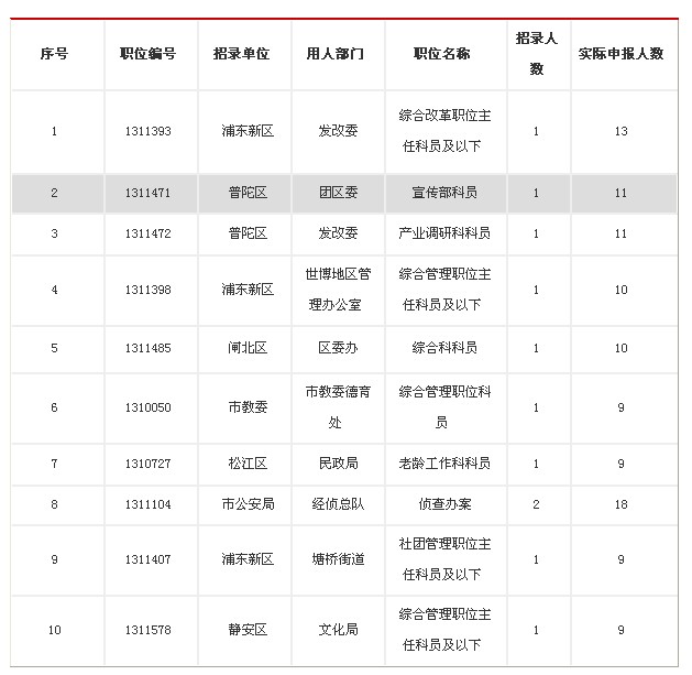 上海公務員18日職位報名競爭激烈程度排名
