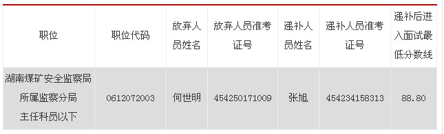 2013年國考面試遞補(bǔ)公告:湖南煤礦安全監(jiān)察局