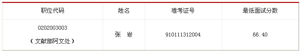 因個(gè)別進(jìn)入面試的考生自愿放棄面試資格,根據(jù)中央組織部、人力資源和社會(huì)保障部、國(guó)家公務(wù)員局關(guān)于公務(wù)員考試錄用工作的有關(guān)規(guī)定,在報(bào)考該職位的公共科目筆試成績(jī)合格的考生中,按照成績(jī)由高到低的順序進(jìn)行遞補(bǔ),名單如下: