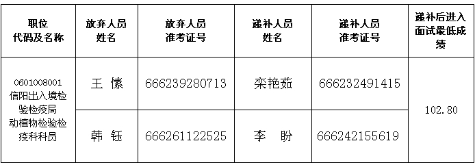 因部分進入面試名單人員自愿放棄面試資格,根據(jù)公務員考錄有關規(guī)定,擬進行遞補(詳見下表)。