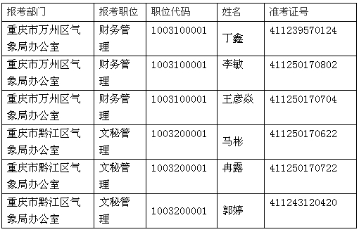根據(jù)中組部、人力資源社會(huì)保障部、國(guó)家公務(wù)員局有關(guān)規(guī)定,按照擬錄用人數(shù)與面試人數(shù)1:3的比例,對(duì)已通過(guò)公共科目考試的考生,按分?jǐn)?shù)高低確定面試人員,萬(wàn)州區(qū)氣象局辦公室財(cái)務(wù)管理職位面試最低分?jǐn)?shù)線為98.6分,黔江區(qū)氣象局辦公室文秘管理職位面試最低分?jǐn)?shù)線為103.8分。