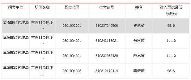 由于部分考生個(gè)人自愿放棄面試資格,根據(jù)中央機(jī)關(guān)及其直屬機(jī)構(gòu)考試錄用公務(wù)員的有關(guān)規(guī)定,按公共科目筆試成績(jī)由高到低的順序,確定以下4人遞補(bǔ)參加2013年度天津市省以下郵政監(jiān)管機(jī)構(gòu)公務(wù)員招錄面試。