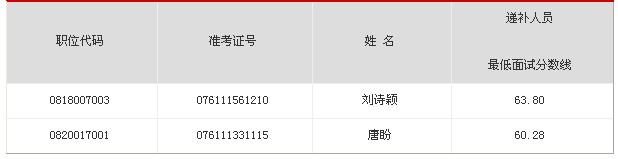 因部分考生放棄面試資格,根據(jù)公務(wù)員招考有關(guān)規(guī)定,擬在公共科目筆試、專業(yè)科目筆試成績(jī)合格的考生中,按照筆試合成成績(jī)從高到低的順序,遞補(bǔ)以下考生為面試人選: