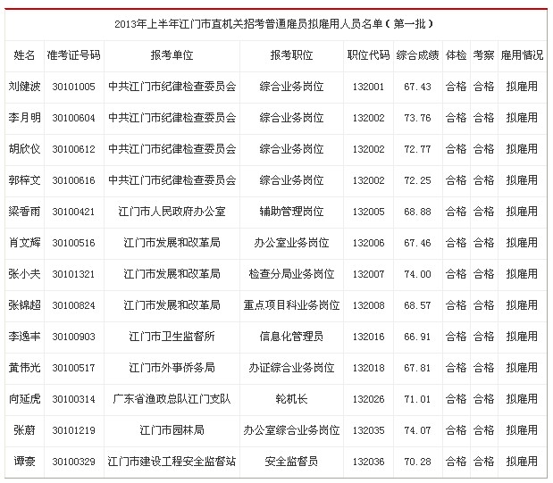 根據(jù)經(jīng)2013年上半年江門市直機(jī)關(guān)普通雇員考試,劉健波等13 名同志符合雇用條件,擬同意雇用,現(xiàn)予以公示。公示期間,如對(duì)擬雇用人員有異議,可通過來信、來電、來訪等形式向我們反映。公示期滿,對(duì)沒有問題或反映問題不影響雇用的,按程序辦理雇用手續(xù)。