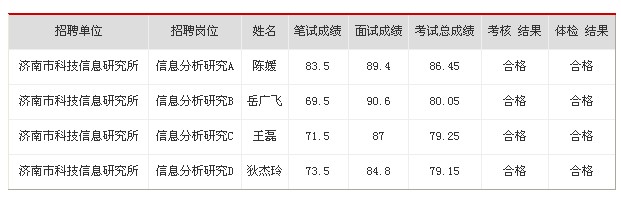 根據(jù)《2012年濟南市市屬事業(yè)單位公開招聘工作人員簡章》的規(guī)定,經(jīng)過報名資格審核、筆試、面試、考核、體檢等程序,確定4名擬聘用人員,現(xiàn)公示如下: