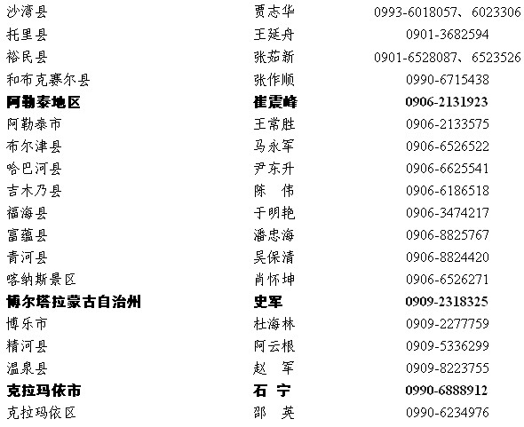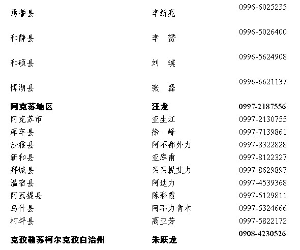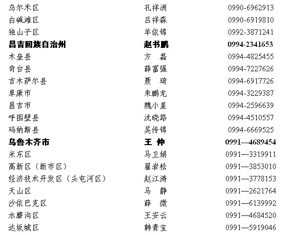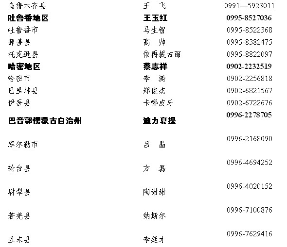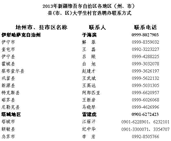 2013年新疆維吾爾自治區(qū)各地區(qū)大學(xué)生村官選聘辦聯(lián)系方式