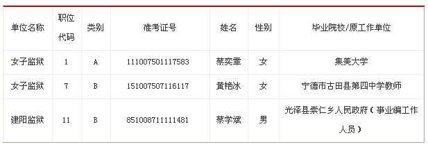根據(jù)公務(wù)員錄用相關(guān)規(guī)定,在筆試、面試、體檢和考察合格的基礎(chǔ)上,擬錄用蔡奕霏等3人為省監(jiān)獄系統(tǒng)公務(wù)員?,F(xiàn)向社會(huì)予以公示。公示期間,如有問(wèn)題,請(qǐng)及時(shí)反映。