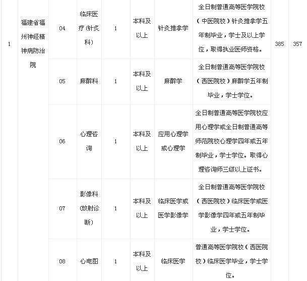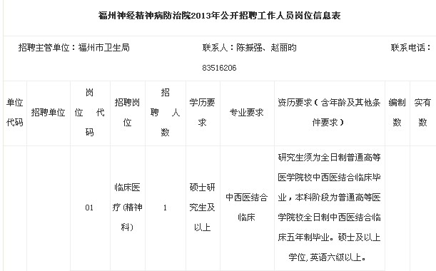 一、招考崗位、條件及要求詳見《福建省福州神經(jīng)精神病防治院2013年招聘工作人員計劃一覽表》(可登錄福州市人才市場網(wǎng)站、福州衛(wèi)生人才網(wǎng)站、福州市第四醫(yī)院網(wǎng)站查詢)。