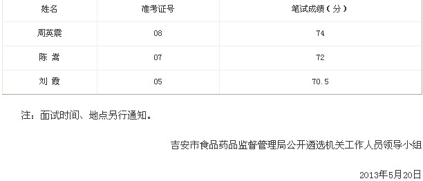 2013年5月18日,吉安市食品藥品監(jiān)督管理局公開遴選機公務(wù)員進行了筆試,從高分到低分前3名入闈參加面試人員名單如下: