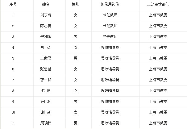 我單位根據(jù)《上海市事業(yè)單位公開招聘人員暫行辦法》(滬人社專發(fā)[2009]45號(hào))的要求,擬錄用以下人員,現(xiàn)將有關(guān)情況予以公示,公示期間,如有異議,請(qǐng)向我單位反映。