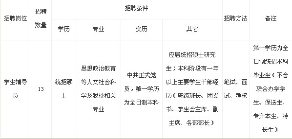 根據《黑龍江省事業(yè)單位公開招聘人員暫行辦法》(黑辦發(fā)[2006]32號)、《關于印發(fā)<黑龍江省省直事業(yè)單位公開招聘工作人員實施細則>的通知》(黑人社發(fā)[2011]68號)和《關于進一步規(guī)范省直事業(yè)單位公開招聘考試管理工作的通知》(黑人社函[2011]616號)等文件要求,經研究決定,現(xiàn)面向社會公開招聘輔導員,現(xiàn)將有關事宜公告如下: