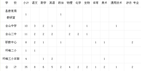 含山縣教育局教研室(教研員)選調(diào)范圍為本縣完(職)中和初中在編在職教師;含山中學、含山二中和縣職教中心文化課教師選調(diào)范圍為本縣農(nóng)村完(職)中和初中在編在職教師;縣職教中心涉農(nóng)專業(yè)課教師選調(diào)范圍為縣高級職業(yè)中學在編在職教師;環(huán)峰第二小學、環(huán)峰第三小學選調(diào)范圍為本縣農(nóng)村小學在編在職教師。