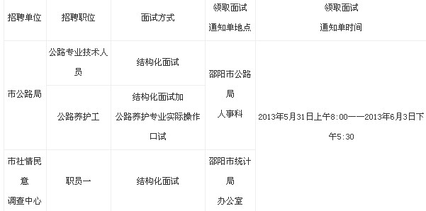 根據(jù)《邵陽(yáng)市事業(yè)單位公開(kāi)招聘工作人員實(shí)施細(xì)則》和《關(guān)于2012年度邵陽(yáng)市部分市直事業(yè)單位公開(kāi)招聘工作人員的通知》(邵人社發(fā)[2013]26號(hào))文件規(guī)定,我局于2013年5月22日在邵陽(yáng)市人力資源和社會(huì)保障局網(wǎng)(http://www.sysrs.gov.cn/)公布了邵陽(yáng)市社情民意調(diào)查中心等事業(yè)單位筆試成績(jī),2013年5月28日公布了面試入圍人員名單。經(jīng)研究定于2013年6月4日進(jìn)行面試,面試方式和領(lǐng)取面試通知單時(shí)間、地點(diǎn)見(jiàn)附件,面試的注意事項(xiàng)請(qǐng)考生仔細(xì)閱讀面試通知書(shū)背面的《邵陽(yáng)市事業(yè)單位招考考生面試守則》。