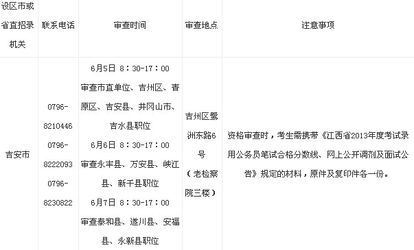 摘要 2013年江西吉安公務員面試資格審查時間表