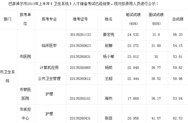 2013年巴彥淖爾市直事業(yè)單位筆試成績(jī)及擬錄用人員公示