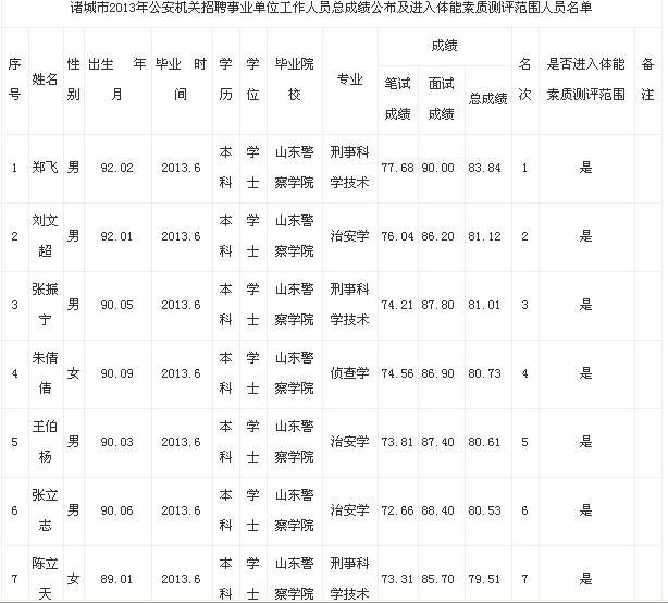 2013年諸城市公安機關(guān)招聘總成績及體能測評名單