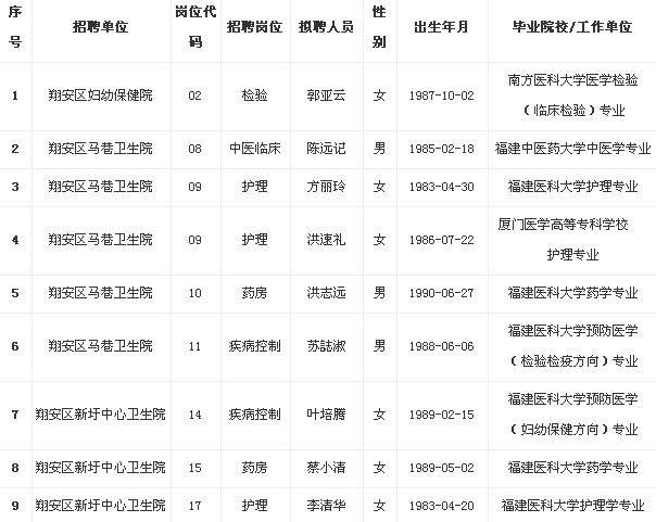 根據(jù)《廈門市事業(yè)單位補(bǔ)充工作人員暫行規(guī)定》的文件精神,廈門市翔安區(qū)衛(wèi)生系統(tǒng)事業(yè)單位2013年補(bǔ)充編內(nèi)工作人員考試的公開招聘,通過筆試、面試、體檢、考核等程序,現(xiàn)將翔安區(qū)婦幼保健院等單位擬聘用人員公示如下: