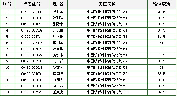 根據(jù)2013年中央單位接收安置軍轉(zhuǎn)干部統(tǒng)一筆試成績,現(xiàn)將中國殘聯(lián)2013年接收安置軍轉(zhuǎn)干部面試人員名單和成績公告如下:
