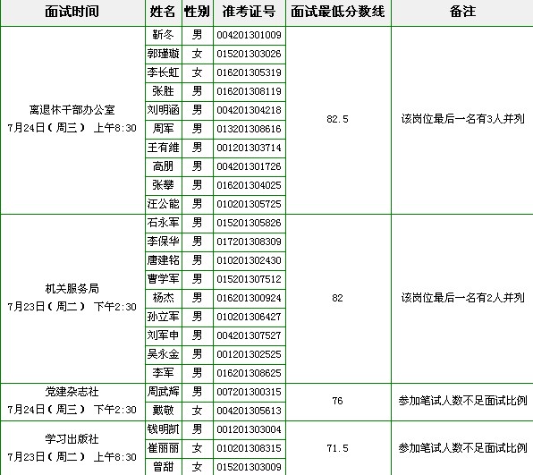根據(jù)筆試成績由高到低順序和不超過1:8的比例,確定以下面試人選(名單附后)。其中最后一名出現(xiàn)分數(shù)并列的,并列人員全部進入面試;參加筆試人數(shù)不足面試比例的,以實際到考人數(shù)為準;如有軍轉(zhuǎn)干部放棄面試的,按照統(tǒng)一筆試成績排序依次遞補。