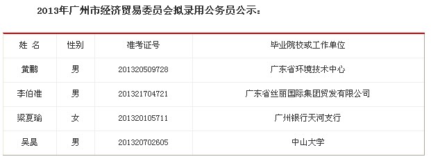 2013年廣東廣州市經(jīng)濟貿(mào)易委員會擬錄用公務(wù)員公示